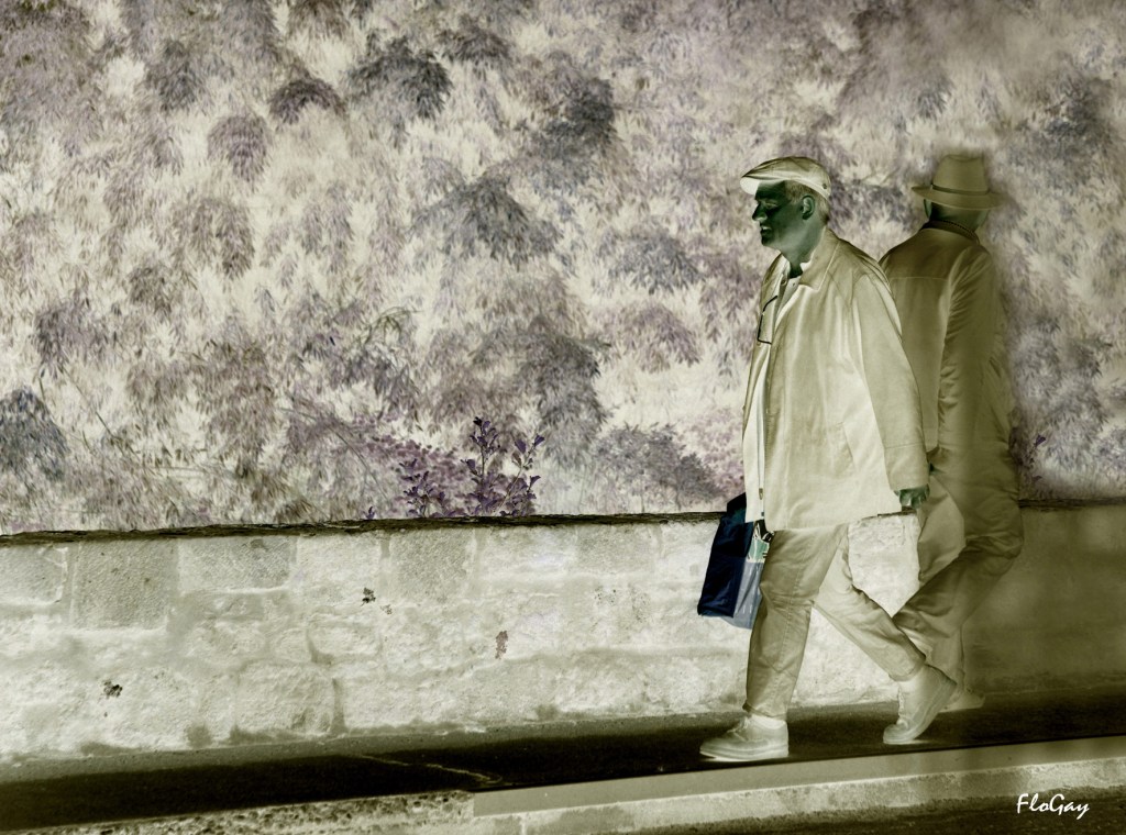 de regarder le monde .Elle saisit des instants de vie: les pèlerins sur le chemin, les silhouettes rapides et lumineuses sur le trottoir d’en face …
